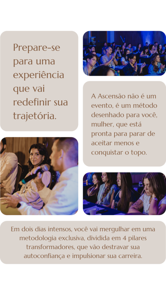 Ascensão é uma imersão presencial de 2 dias criada para mulheres que sabem o valor que têm, mas ainda não ocupam o lugar de destaque que merecem.