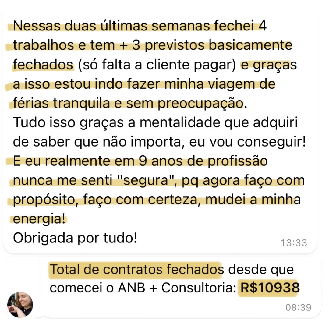Carol é fotógrafa com 9 anos de experiência, mas nunca se sentia segura para cobrar o que valia. Após o Confiança Inabalável, fechou R$10.938 em novos contratos em menos de 1 mês e conseguiu viajar tranquila pela primeira vez, sem medo de faltar dinheiro.